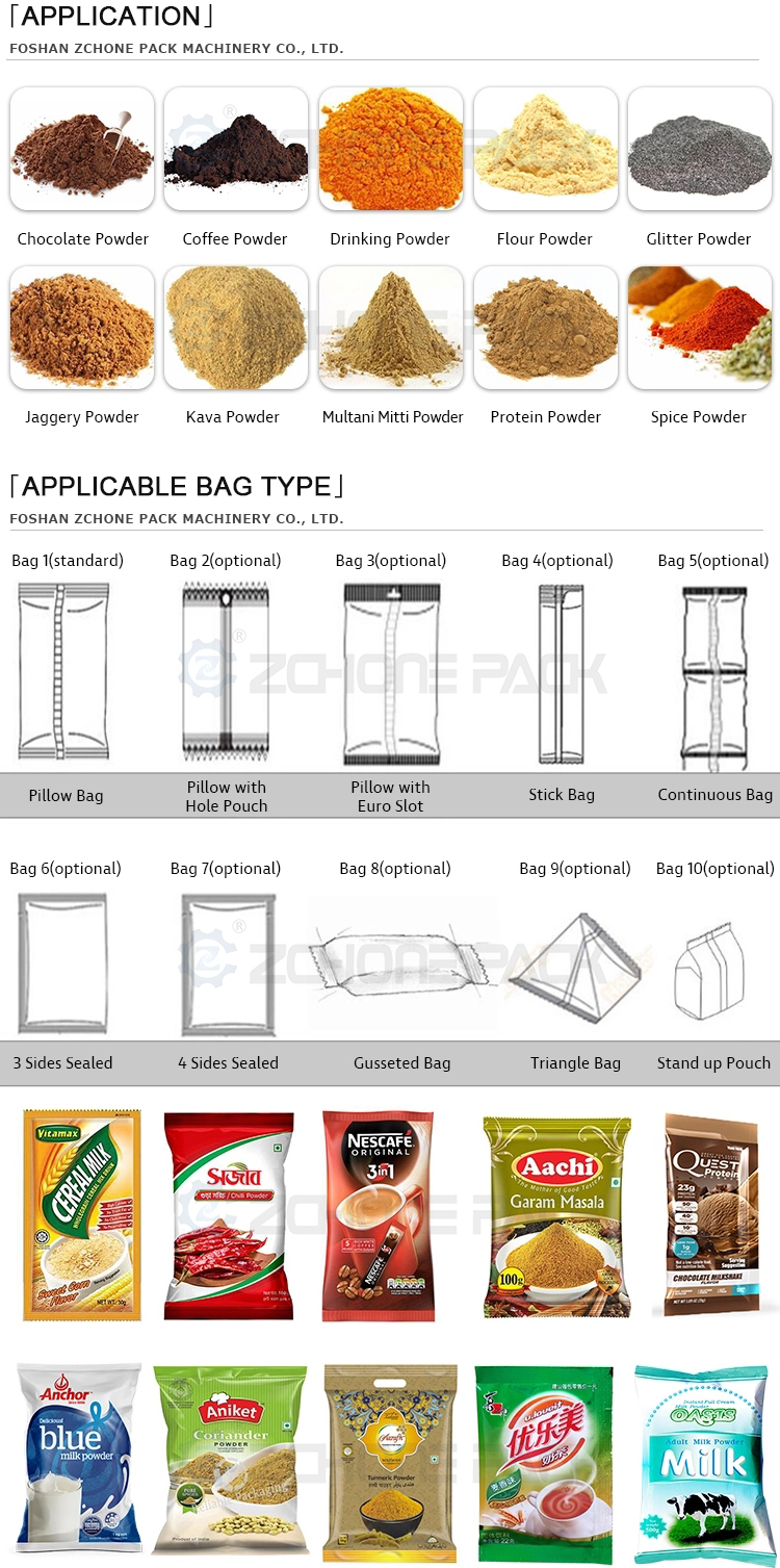 Torebka z czterema uszczelnieniami, Torebka z tylnym uszczelnieniem, Torebka typu poduszka, Pionowa maszyna pakująca do proszku